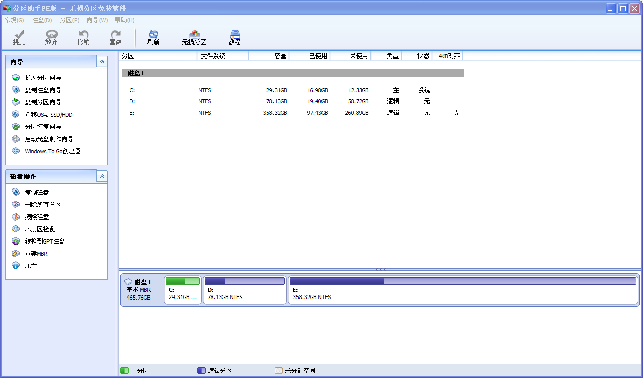 分区助手WinPE专用版适合在WinPE2.x, WinPE 3.x and all WinPEs环境中运行,比如大白菜PE工具箱、通用PE工具箱等,其具有磁盘分区、拷贝、迁移、恢复及删除系统、引导系统分区等管理功能。
