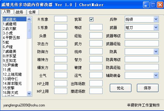 曹操传MOD戚继光传的修改器 作弊器的功能: 修改人物以及属性,战场,仓库和物品等
