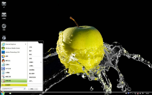 这款win7主题依然是非常简洁给力的,一个悬浮在半空的苹果在晶莹的水珠中静静的呆着,这个苹果可不是乔布斯的那个被咬了一口的苹果,那么这个苹果也就能寓意着尽善尽美哦!