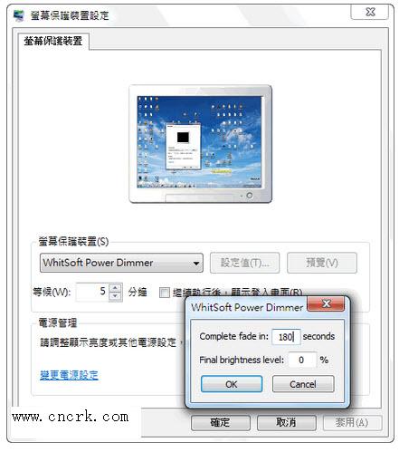 安装方式:将压缩档内的「PowerDimmer.scr」放入「C:\Windows\System32」之中,之后开啟萤幕保护程式的设定,就可以看到「WhitSoft Power Dimmer」的选项,设定值能调整淡出的秒数,看大家是喜欢快速地淡出,还是慢慢慢慢地淡出,另一个数值是调整最后的透明度,0%的是代表全黑,若是设定成50%的话,萤幕最后就会呈现半黑的状态育!