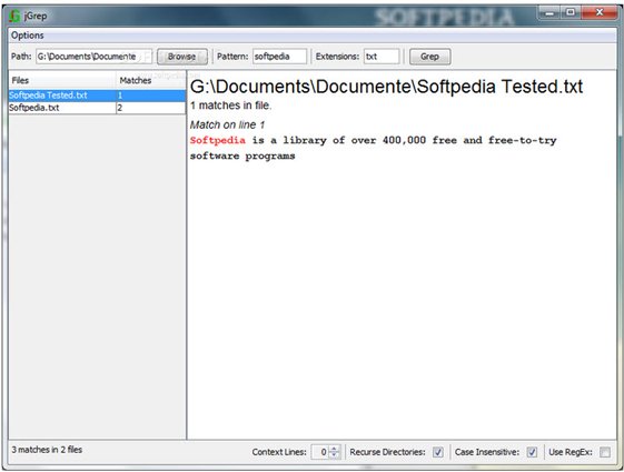 作为一个跨平台的图形文件搜索工具后GREP为蓝本,设计jGrep。该方案可以让您快速搜寻的文字或比赛在一个单一的文件或目录的正则表达式的字符串,在一个简单而直观的用户界面,。其他功能还包括一个强大的查找/替换工具和能力,以保存和加载过去的搜索。
