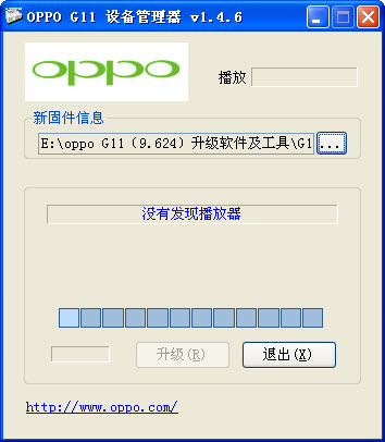 用数据线连接机器与电脑,双击软件包中的exe文件,如: OPPO S19 DM工具.exe,显示DM升级工具对话框。DM工具将自动搜索到需要升级的固件。点击“升级”,升级时间持续1分钟左右,升级完毕后退出程序即可。升