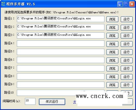 CF多开器 2.5 绿色免费版 CF多开器是cf穿越火线游戏多开工具,无限开任意个穿越火线,只要机器负担的起,最多可同时运行10个穿越火线程序,真正的cf多开工具,绿色无毒。进入CF多开器,首先要设定好游戏的路径,然后才能顺利的多开!