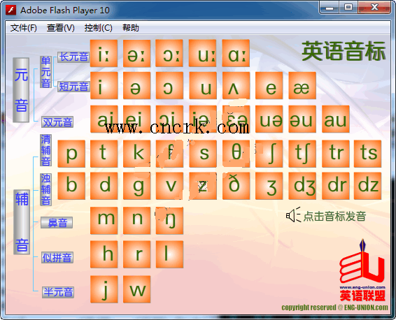 英语音标发音flash版本,适合各种环境运行,完全免费无广告。 点击就有48个英语音标的标准发音,并且有发音口形视频,学习者可以随意听声音,看口形进行模仿训练。让所有中国人脱离英语发音的困扰。