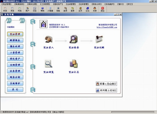 商易财务软件免费版完全适合最新的财务会计制度。商易财务软件免费版高度集成凭证管理、账簿报表、期末处理、工资管理、固定资产、出纳管理、往来管理、财务分析、系统维护等模块,功能全面,采用导航图功能,商易财务软件免费版兼容Microsoft Excel,同时设置了多币别、多核算项目,各项技术指标及功能可完全满足企业级用户的实际应用需求。