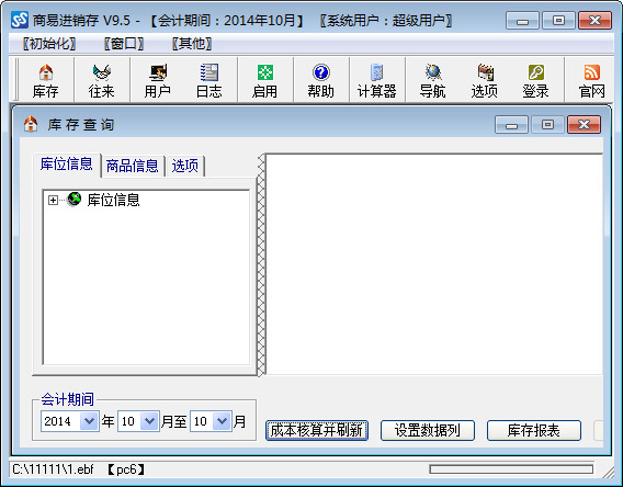 主要功能模块:商品信息、库位信息、供货商信息、客户信息、职员信息、摘要信息、用户管理、操作日志、自定义单据、财务转账、月末结账、单据号调整、账套选项;