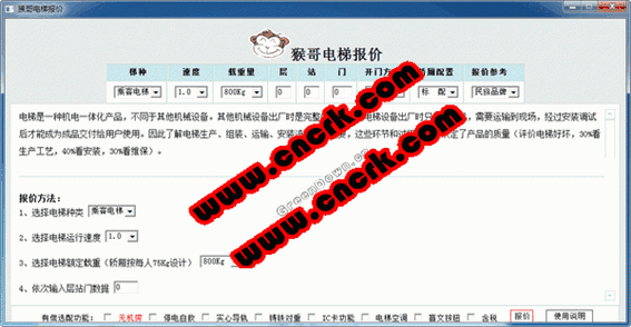 猴哥电梯报价 2.3 简体中文绿色免费版 猴哥电梯报价软件是一个从事电梯业多年,没有什么背景、拥有激情与梦想、不甘平凡、不安于现状,倡导“渠道扁平化”的年轻人侯洋编写的国内首个绿色、迷你无需安装电梯计价软件。 该软件实现了乘客电梯、载货电梯、观光电梯、病床电梯等八种目前常用电梯详细功能报价,专业解决了业主、造价师、采购主管、房地产公司等电梯用户采购预算问题。经众多用户测试此报价在中国300多个电梯品牌、四大梯队报价数据中、在同材质、同配置、同服务时处于最优!