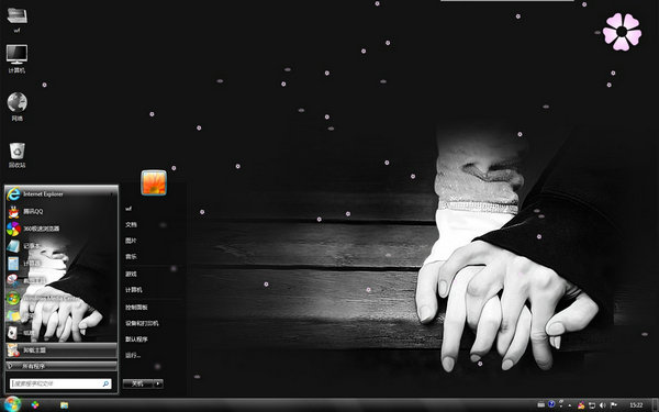 这款牵手的约定win7主题的桌面背景是黑白色调的,在木质的靠椅上,热恋中的男女十指相互交缠的握在一起,虽然这只是简单的牵手,但是也包含着深沉的含义,牵手的约定就是一辈子在一起,相互扶持,相互依偎的约定,只要彼此牵手,就要一直走下去哦
