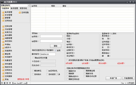 QQ万能通特色,空间克隆验证码全免,支持批量留言、日志管理、相册管理、Q宠乐斗、群管理等 功能。