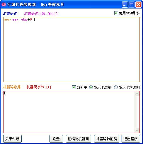 汇编代码转换器是一款Asm汇编语言转易语言的置入代码小工具。该软件允许用户自定义文本,可以修改背景颜色。汇编代码转换工具有Masm引擎和Ce双引擎,可以快速进行机器码和汇编之间的转换。