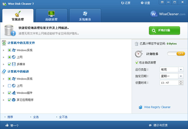 明智的磁盘清洁,检测和清除PC上的所有垃圾文件,包括临时文件,IE浏览器的历史和其他垃圾文件。