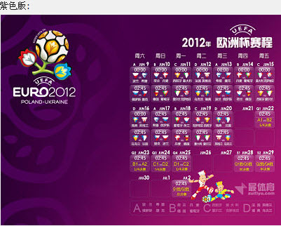 2012欧洲杯赛程壁纸2012年欧洲杯马上就开始了,相信要看的同学不少. 今天,黑色特别给大家带来一套由最体育精心给大家制作的一套相当漂亮的欧洲杯赛程壁纸. 本套壁纸总共分四色,蓝色,灰色,紫色,绿色.每种颜色共7种分辨率.