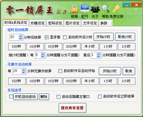 零一锁屏王是一款功能简单的系统屏幕锁屏软件。软件可以随意设置锁屏时间,主要功能就是不让别人随意乱动你的电脑,可以杜绝隐私保护和防止小孩子偷玩电脑游戏。小编极力推荐,希望广大网友喜欢。