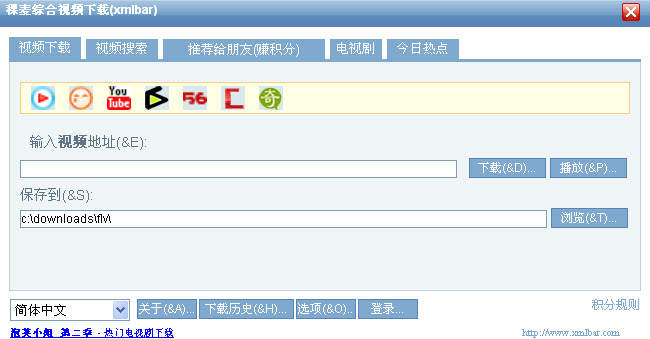 稞麦综合视频站下载器(xmlbar)是一个专门用于下载YouTube,CNTV流媒体,奇艺,百度贴吧,优酷,土豆,酷6,56等重要视频网站到本机硬盘上的小软件。