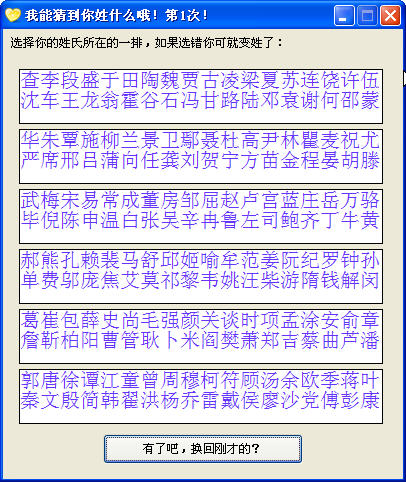 一款娱乐猜姓软件,测试当娱乐就好了!! 36个姓的只需要猜两次。。。 216个姓的也仅仅只需要3次哦。。。