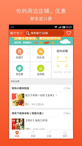 1.您的周边店铺、优惠,都收进口袋2.在家、公司动动手指,轻松订外卖