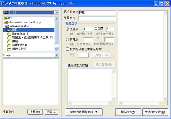 分轨CUE文件生成器,只要用播放器打开生成好的cue,就能很方便地欣赏整个文件目录下所有的音乐文件了。它不但可打开cue文件,最主要的还是可以轻松生成cue文件。