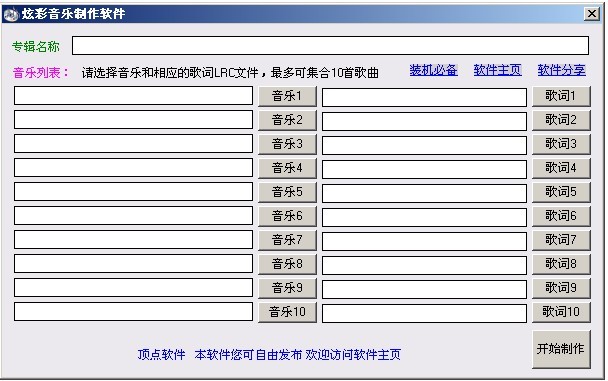 炫彩音乐制作 v1.4绿色版 炫彩音乐制作软件是一款非常好用的音乐专辑制作软件,能将你喜欢的歌曲和歌词合并在一个音乐专辑文件中,生成独立的EXE文件,自动播放。