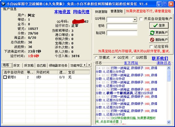 QQ家园守卫战辅助帮助您在好的位置盖塔、升级塔(经济考虑:只需要盖多少个塔,塔升级到什么程度可以通过本关)、帮您抓好友做奴隶,到好友城镇贸易,收税等。可以节省您很多宝贵的时间去做其它更重要的事情。