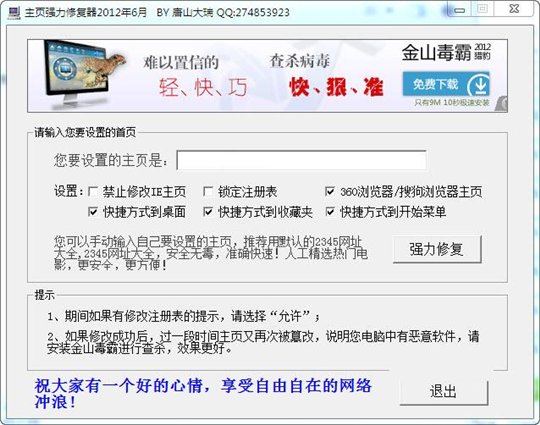 曾经有过主页被恶意修改的经历,当时,费尽九牛二虎之力,下载了多个工具软件,也未能将之改回来,无奈之下只有重做系统。因为这个简单问题都没能解决,很是惭愧,于是,下定决心,自己动手写了一个设定主页的工具软件,经过多次测试,都能将顽固篡改修正过来,于是,发布该工具,希望能够帮助同受此害的朋友,以解燃眉之急。(注:建议常上网的朋友还是应该安装杀毒软件和防火墙,这年头,没它可不行。另,该工具是绿色版本,无需安装)