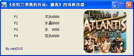 亚特兰蒂斯的传说撤离修改器 Legends Of Atlantis: Exodus 对应进程: atlantis.exe 修改器功能: F1 木头8888 F2 水晶8888 F3 水 8888 F4 石头8888