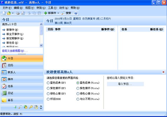 EfficientPIM Free 直观界面富有吸引力,拥有多种配色方案可供选择。EfficientPIM的布局非常类似于Microsoft Outlook,与日历,联系人,事件,任务,日记和便笺标签。该软件还具备搜索功能,密码管理器和桌面的说明功能。例如,可以很容易地创建新的事件,但仍然是一个定制的高层次与重要性,复发设置,彩色标签,灵活的提醒,甚至,用户定义的警报声音。联系不仅包括姓名和地址字段,对配偶,生日和周年纪念,爱好,甚至照片。