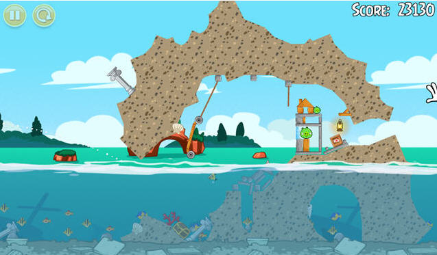 小鸟们的战争全线转移,大家可以尝试在水中射击的新玩法。开发商加入了新的物理引擎,水中的小鸟将会借助浮力改变飞行轨迹,然后绕过障碍消灭那些绿猪。