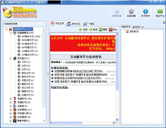 互动游戏对战平台继承于源老款《互动游戏中心》,昔日的热门竞技游戏平台在历经关闭风波沉寂多日之后全新发布。的是一款类似QQ、浩方的竞技游戏对战平台,本平台目前能进行联网的游戏有:流行蝴蝶剑、罗马复兴、征服者、帝国时代1、帝国时代2、帝国时代3,红警2、红警3、CS1.6,CS1.5,星际争霸、魔兽争霸(冰封王座)。