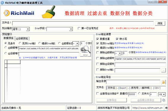 email地址导出:按数据行数,文件大小分割导出;按邮件域导出