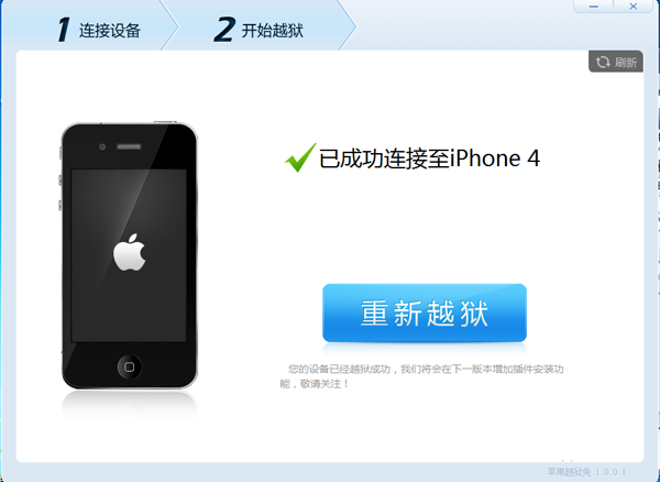 2、苹果越狱兔提示连接成功,点击“开始越狱”按钮
