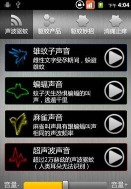 电子驱蚊器根据生物学和物理学原理,通过仿真昆虫声波和蚊虫共振声波驱赶室内蚊虫。相比传统的蚊香和电蚊香、驱蚊水,您再也不必担心那些不靠谱的化学物质对身体的侵害! 运行电子驱蚊器开始按钮,手机会发出无伤害却能驱赶蚊虫的声音,享受一个没有蚊的夏天。这是一个小的软件,让蚊子远离。使用简单,有用的。无需任何外部设备。喜欢的你还等什么,赶快来下载使用吧!