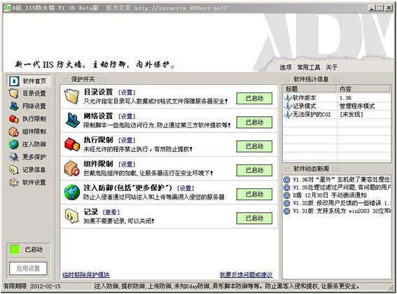 啊D专为IIS设计的一个主动防御的保护软件,以内外保护的方式 防止网站和服务器给入侵,在正常运行各类网站的情况下,越少的功能,服务器越安全的理念而设计! 限制了常见的入侵方法,让服务器更安全!