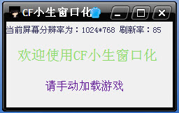 cf窗口化工具莫小生辅助加载游戏后,分辨率大小为1024*768。刷新率为85. 请运行cf窗口化工具,再登陆CF游戏。就可以自动把原来全屏的游戏转化为窗口化显示的。方便友友们边玩游戏边聊天哦。
