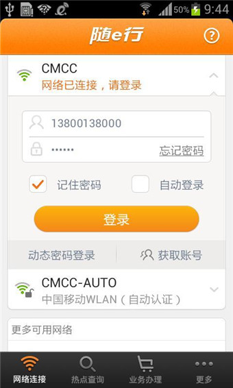 2.完美适配中国移动WLAN热点(CMCC/ CMCC-AUTO /CMCC-EDU),支持一键配置、用户名和密码免记忆、热点智能提醒