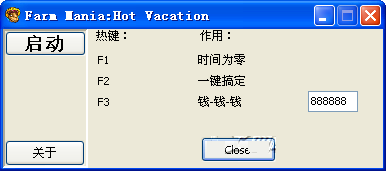 狂热农场火热假期修改器 功能: F1 时间为零 F2 一键搞定 F3 金钱数修改