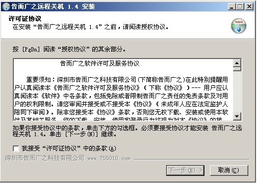 告而广之远程关机 1.4 官方版下载 告而广之远程关机系统与市面上的远程控制系统不同,我们的目标仅仅是关闭或者重启安装了我们网络版软件的服务器,方便用户管理,增强服务器的安全防护(如果采用远程桌面连接,则服务器对于访问者而言没有任何安全防护,访问者可以像访问自己电脑一样访问服务器)。
