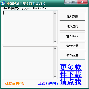 小邹过滤重复字符工具操作简单,小邹过滤重复字符工具主要就是过滤掉重复的内容一般用于字典过滤等等知道的都知道杂用撒。我就不多介绍了。小邹过滤重复字符工具软件界面简单。小邹过滤重复字符工具免费,大家收藏下把。