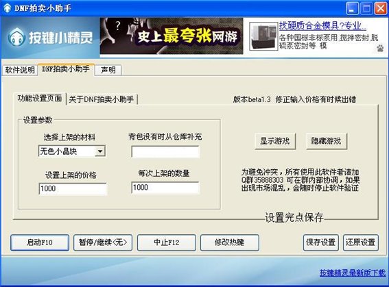 DNF外挂功能说明: 暂时可上架5种小晶块,其他材料以后慢慢补充 使用中必须在出生的房间内,游戏窗口分辨率800×600,不可遮挡 上架物品必须在个人仓库,第一页一打开就能看到