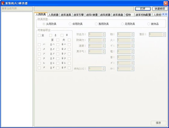 重装机兵3修改器 NDS游戏机版本的重装机兵游戏作弊工具 功能主要有: 人类防具修改 人类武器修改 战车道具作弊 战车引擎,战车C装置,战车武器,战车地盘,怪物修改,初始配置等