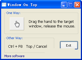 让窗口总在最前(window on top) 2.0 免费绿色版 window on top是一款电脑窗口置顶工具,他可以让任意一个窗口总是靠在最前端。软件绿色小巧免费版,欢迎使用。