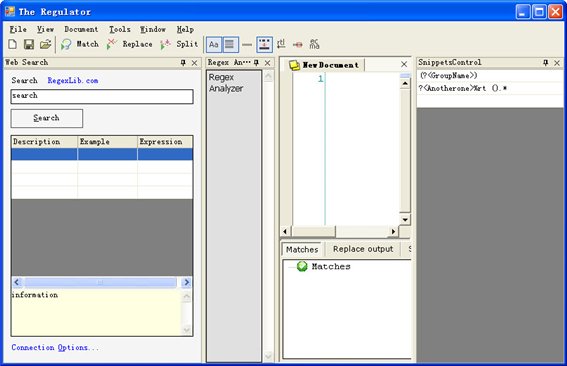The Regulator是设计来解决这个时间的stealer phase阶段,让您的环境中,类似的“IDE”,除其他外,它允许你创建正则表达式,预览运行你的表达,结果在一个特定的一套工具投入,在正则表达式编辑窗格的语法高亮,共同表达使用权范围内的应用Regexlib.com的网络服务,并导入你到编辑窗格中找到适合的表达式在线搜索能力。