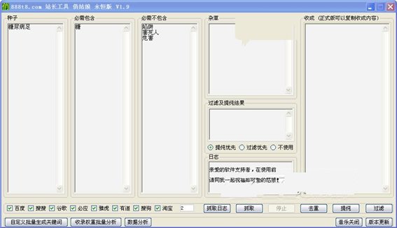 2.该软件中的提纯,过滤功能是我们为您量身定做的“嫁衣”,让您在第一时间获取您最想要的关键词,精准度达到99%,不浪费您一分一秒的宝贵时间,无限放大提升您的工作效率!