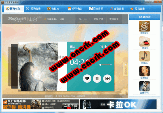IT之家音乐视听是it之家音乐中心集网络上众多在线歌曲播放于一体。IT之家音乐视听目录已加入内容:搜狗电台、百度音乐、soso音乐、酷狗音乐、音乐台mv、亦歌音乐等