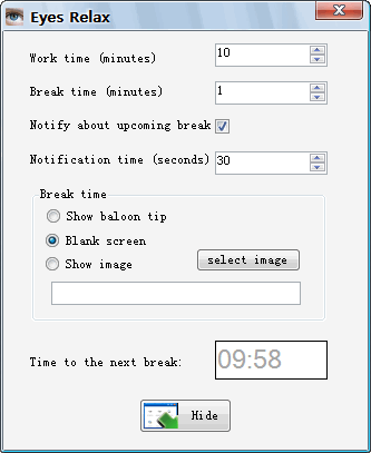 Eyes Relax是一个小巧实用的提醒软件。经常在电脑前工作的上班族,容易产生视觉疲劳,这款小工具就是为了保护视力而设计的。 使用者可以设置工作时长,定时提醒的时长和次数,甚至还可以在提醒时显示一幅你喜欢的图片