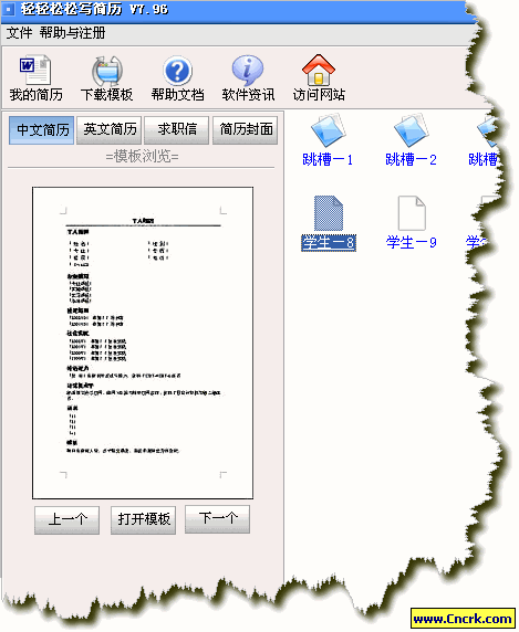 轻轻松松写简历 V8.8 注册绿色特别版 简历往往是招聘人员了解你的第一个途径。一份好的简历,可以在众多求职简历中脱颖而出,给招聘人员留下深刻的印象,然后决定给你面试通知。它是帮助你应聘成功的敲门砖,它使你引人注目。所以说,简历的设计是相当重要的,简洁有序,风格突出,才能达到良好效果。我们推出的软件《轻轻松松写简历》内置各种精美中英文简历及求职信Word文档模板,操作简单,上手容易,精美简历一天就做好!