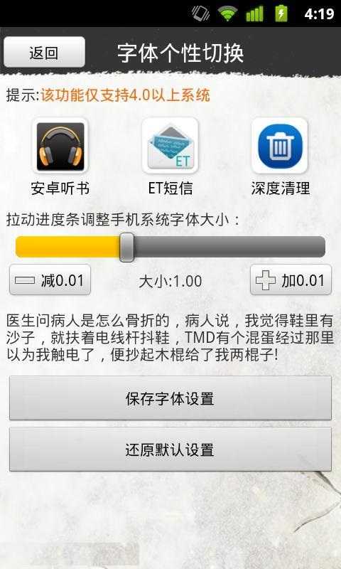 如何才能使自己的手机鹤立独群受到众人瞩目,当你还在羡慕美化高手自己动手修改手机字体库的时候,有没有想过自己也可动手修改手机字体呢?只要使用【手机字体个性切换】即可无需刷机,无需担心修改乱码等问题,通只需过简单的在线下载字体,一秒更换即可轻松简单的美化手机字体,让你的手机因为字体的美化而与众不同。
