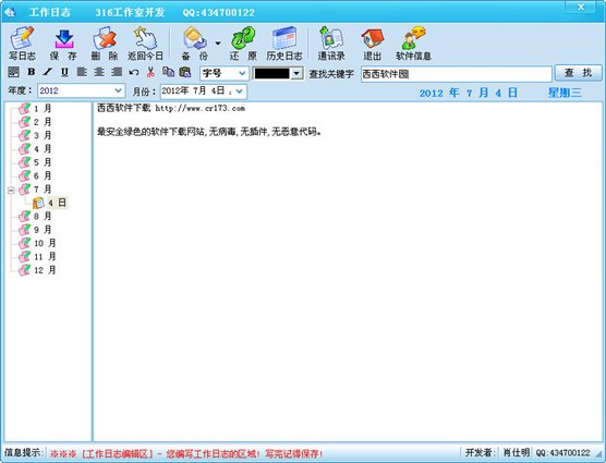 工作日志软件能够帮助您记录下将要做的事情,可存储10万事件,每件可有500字以上的描述和存储。软件对将要做的事情可以及时的提示处理,对做完的事情进行归档,方便事后总结和年终查询。软件还提供特定时段内关键词的快速查询。