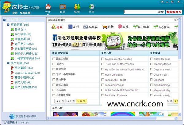 成博士幼儿英语(幼儿英语儿歌、幼儿英语歌曲)包括儿童英语启蒙和幼儿英语儿歌,有儿童喜欢的英文童谣和英文儿歌,也有26个字母和儿童音乐,资源丰富。