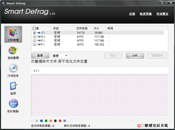IObit Smart Defrag磁盘整理工具 是一款免费的碎片整理程序,能够最有效的帮助你轻松整理碎片。IObit Smart Defrag磁盘整理拥有独特的“安装后自动运行”以及碎片智能诊断技术,无需任何设置和人为操作,就能够全自动运行。软件界面IObit Smart Defrag磁盘整理工具采用业界最先进的ExpressDefrag技术,不仅整理碎片速度非常快,而且还能够对磁盘的文件系统进行优化。IObit Smart Defrag还借助领先的静默整理技术,在后台利用计算机的空闲时刻自动进行碎片整理,让你的硬盘一直保持最高的运行效率。 IObit Smart Defrag磁盘整理工具能够最有效的帮助你轻松整理碎片,不仅速度快,还能同时对磁盘进行化化操作,更强的是,IObit Smart Defrag磁盘整理工具还借助了静默整理技术,可以在后台利用计算机的空闲时刻进行自动整理,而且IObit Smart Defrag磁盘整理工具还在各大下载站点屡获殊荣,相信实力应该不俗。最吸引人的是,IObit Smart Defrag磁盘整理工具还是一款免费软件哦。是不是有点跃跃欲试的感觉啦?那还等什么,快来下载一个试试吧,相信有了IObit Smart Defrag磁盘整理工具之后一定会让你的硬盘一直保持最高的运行效率。
