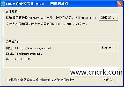 kml文件转换工具是一款阿凯日软件工作室推出的一款将kml(*.kml)文件转换为mif(*.mif和*.mid)文件的文件转换器。